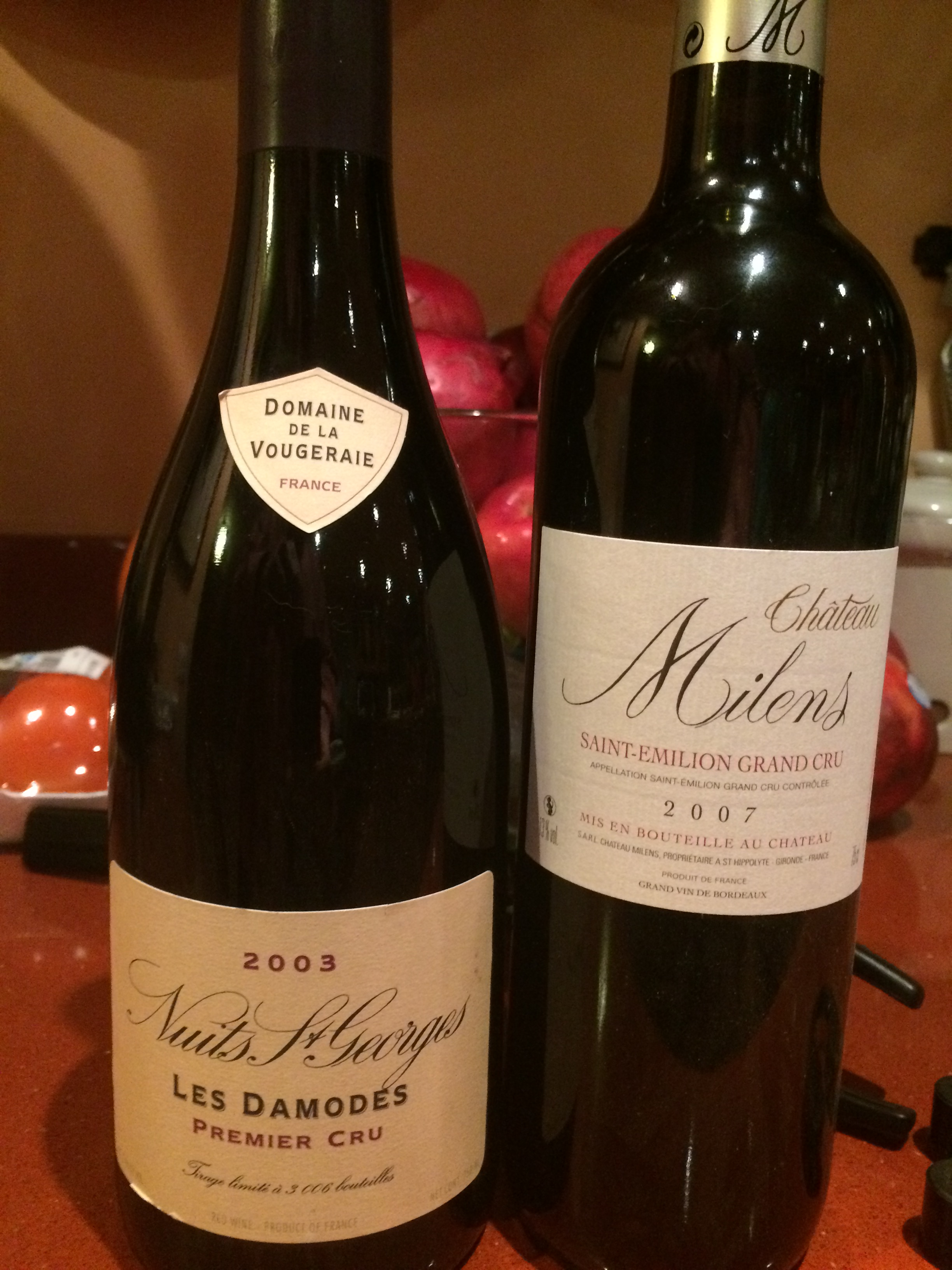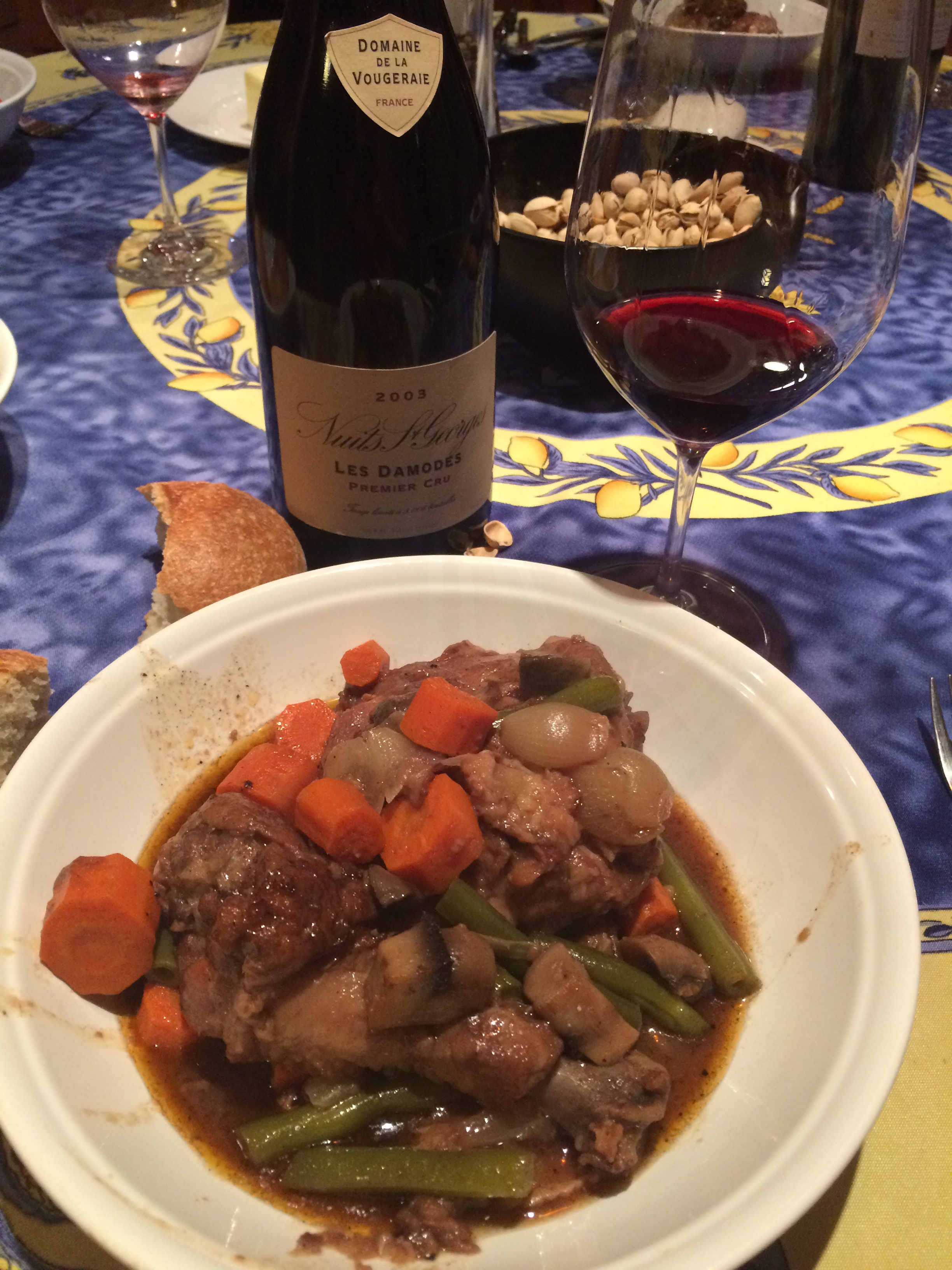The appetizer was squash ravioli with balsamic and sage; Mary used won ton instead of pasta. It was a little sweeter than expected, but very good. We began with the Bordeaux, a 2007 Chateau Millens Saint-Emilion Grand Cru that we purchased in Saint-Emilion in 2013. The wine shop where we purchased it, as part of a mixed case, purchases the entire production of this small producer (so you will not be able to find this amazing wine, except at that shop – sorry). The Bordeaux blend, Cabernet and Cabernet Franc, was very well structured, with a nice mix of cherry fruit and minerality on the nose, and hints of cherry, tobacco, and chocolate on the tongue. It finished very well. This wine was not a perfect match for the unexpectedly sweet appetizer, but it was a very good wine. We still have a couple of bottles left, and the wine could use some additional time to age. With the coq au vin, we poured the Burgundy, a 2003 Domaine de la Vougeraie, Nuits St. Georges Les Damodes Premier Cru Pinot Noir. This wine was a Christmas gift from Dorianne a few years ago. It was simply magnificent.